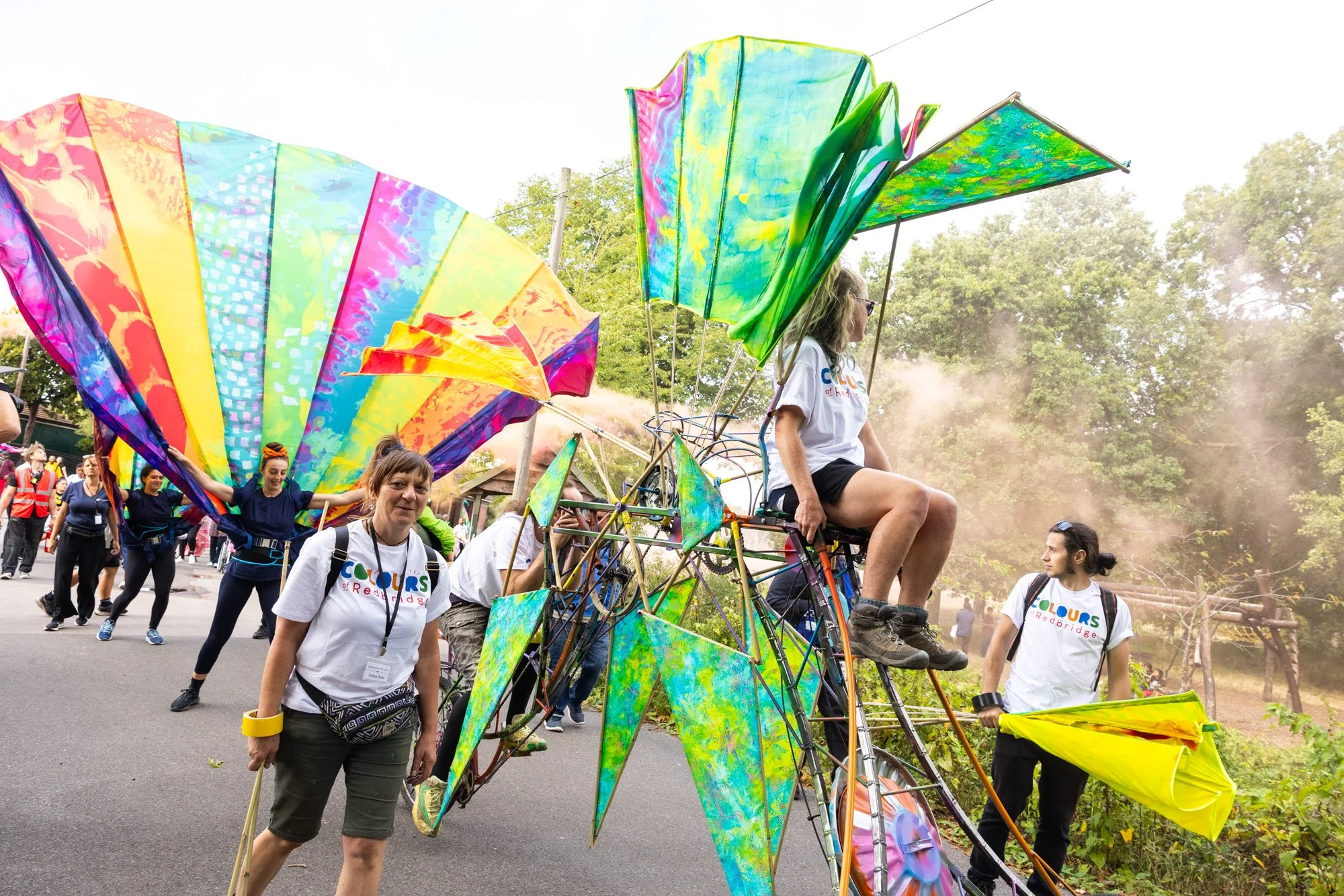 Taravanya, ‘Star of the Wild’ will emerge from Valentines Park, in search of new connections. Her environment is inspired by land and sea, with giant scallop shells and ink-marbled flora and fauna flooding the streets. The parade comes to life with sounds from vibrant samba drums and rediscovered objects.